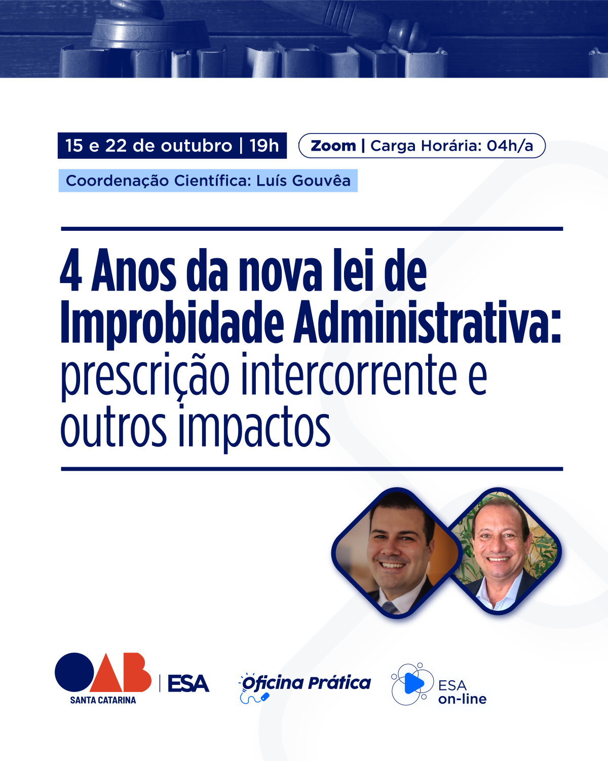 15/10 – Panorama geral da nova Lei de Improbidade, com Newton Osvaldo de Souza Filho, que abordará a evolução da lei, conceitos fundamentais, nova classificação dos atos de improbidade, regras sobre prescrição e outros institutos.
