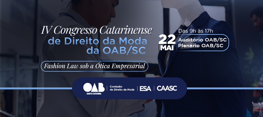 LINK PARA INSCRIÇÃO: https://www.oab-sc.org.br/eventos/fashion-law-sob-a-otica-empresarial-iv-congresso-catarinense-de-direito-da-moda-da-oabsc