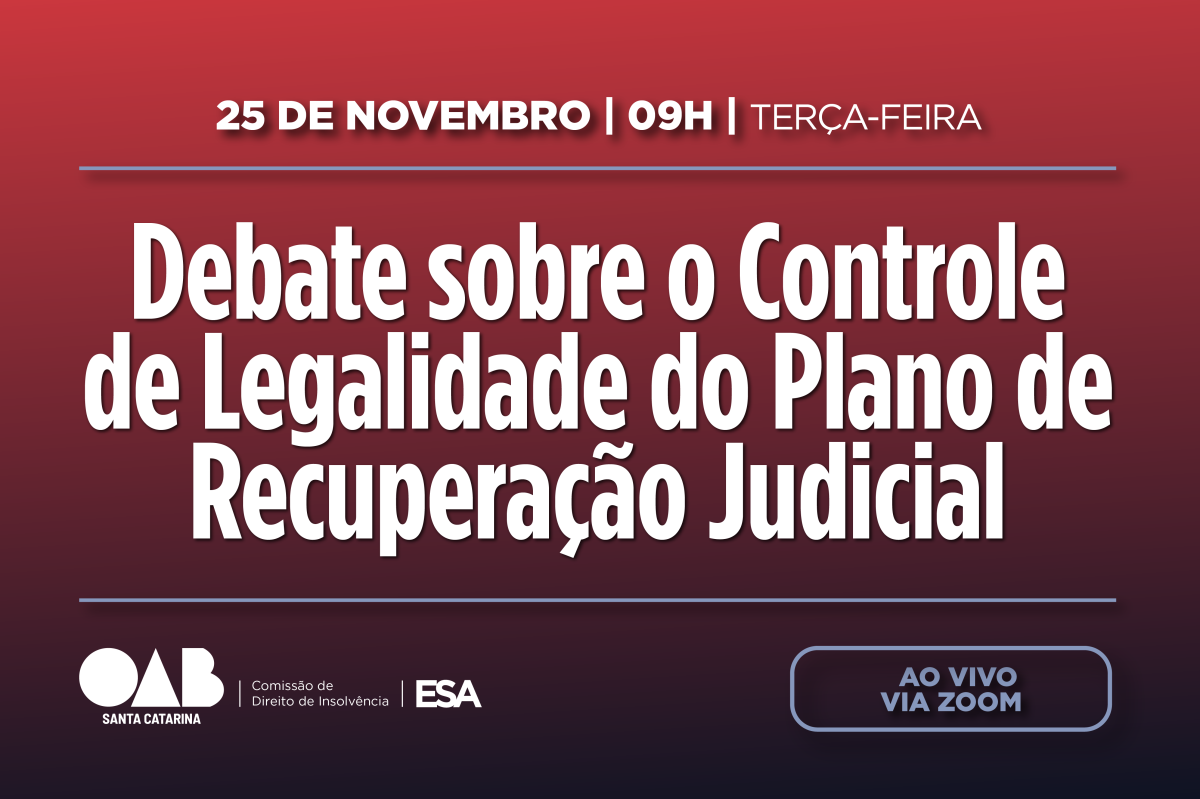 A advocacia catarinense terá uma grande oportunidade de aprofundar-se em um dos temas mais relevantes e desafiadores do Direito Empresarial contemporâneo: o “Debate sobre o controle de legalidade do Plano de Recuperação Judicial”, evento realizado pela Comissão de Direito de Isolvência da OAB/SC. O debate ocorre no dia 25 de novembro, a partir das 9h, de forma online, via plataforma Zoom. As inscrições são gratuitas e podem ser realizadas aqui.
