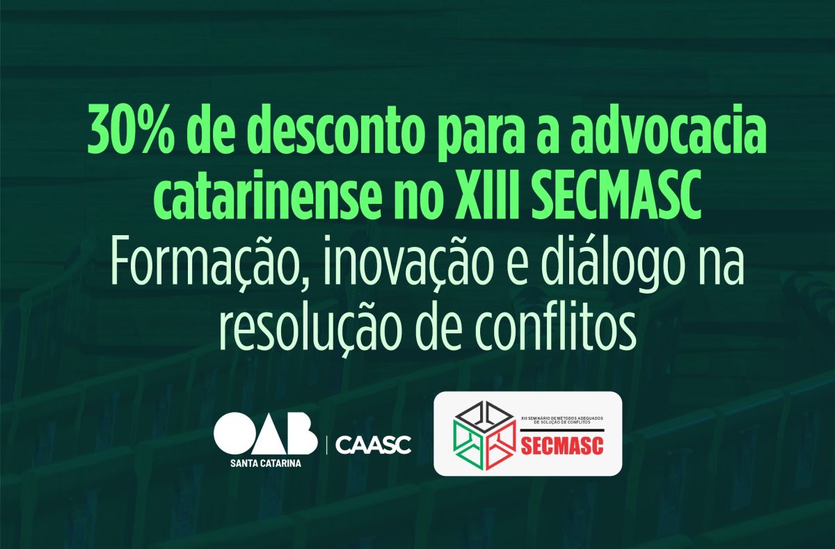 A advocacia catarinense pode garantir 30% de desconto nas inscrições para a 13ª edição do Seminário de Métodos Adequados de Solução de Conflitos (SECMASC), promovido pela Federação das Entidades de Conciliação, Mediação e Arbitragem (FECEMA). Inscrições e mais informações neste link.
