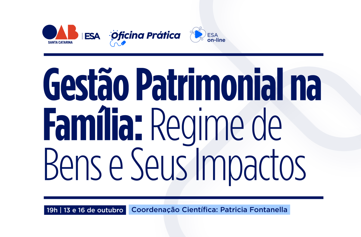 Nos dias 13 e 16 de outubro de 2025, a Escola Superior de Advocacia da OAB/SC (ESA/SC) promove a oficina online “Gestão Patrimonial na Família: Regimes de Bens e Seus Impactos”, destinada a advogados(as), membros da Magistratura, Ministério Público e estudantes de Direito. Com carga horária de 6 horas/aula, o curso será realizado na modalidade virtual, via Zoom, sempre às 19h.