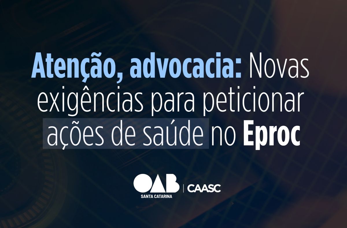 A OAB Santa Catarina informa à advocacia o início da operação da ferramenta “Demandas da Saúde: Obrigatoriedade CID e Tecnologia da Saúde”, no sistema Eproc. A medida, comunicada oficialmente à OAB/SC pelo Tribunal de Justiça de Santa Catarina, busca padronizar e qualificar o peticionamento em ações relacionadas à saúde pública e suplementar.