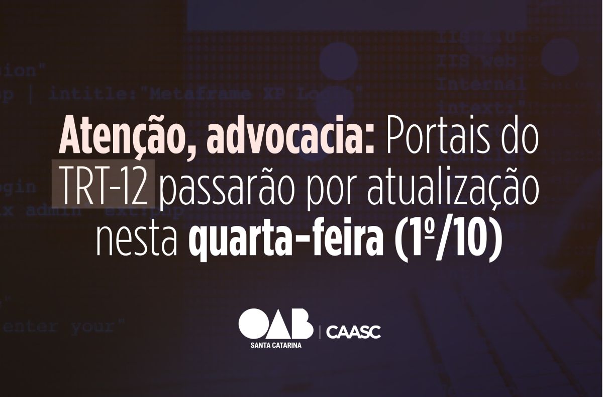 A OAB Santa Catarina comunica que a Seção de Tecnologia da Informação e Comunicação (SETIC) do Tribunal Regional do Trabalho da 12ª Região (TRT12) realizará atualização tecnológica nos Portais de Internet e Intranet nesta quarta-feira, 1º de outubro de 2025, a partir das 10h.