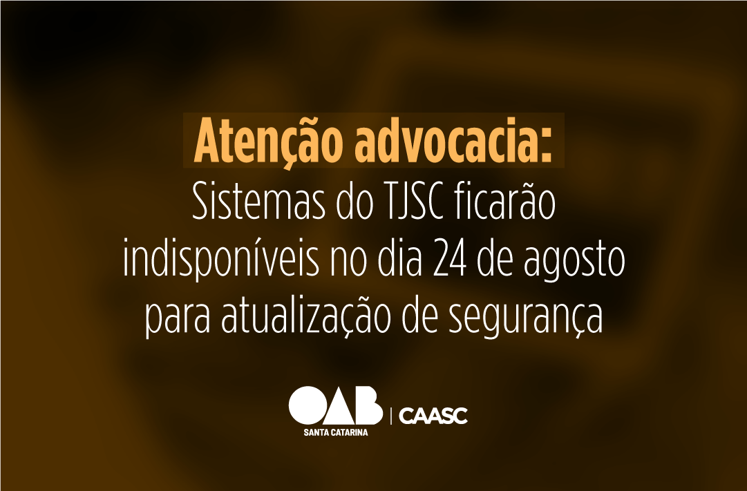 A OAB/SC informa à advocacia que o Tribunal de Justiça de Santa Catarina (TJSC) realizará manutenção programada no próximo domingo, 24 de agosto de 2025, deixando indisponíveis, das 19h30 às 23h30, diversos sistemas administrativos e judiciais do Poder Judiciário catarinense.