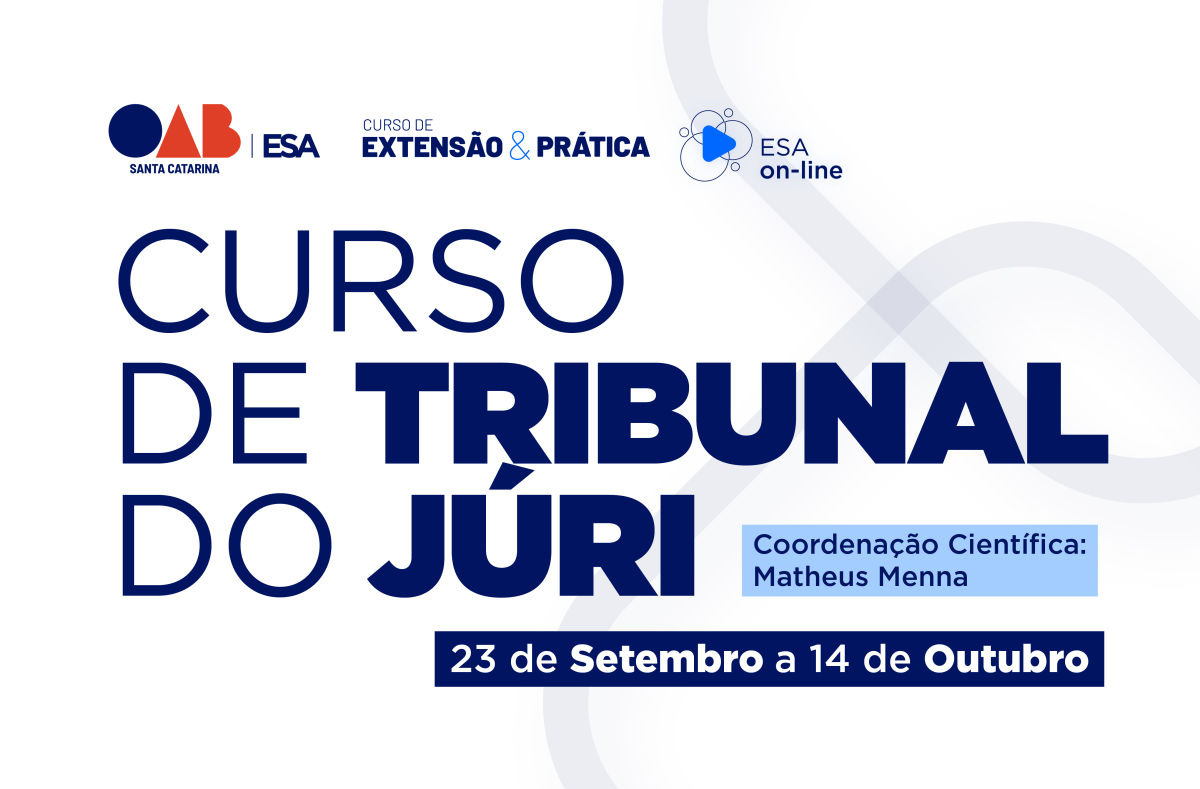A Escola Superior da Advocacia da OAB/SC (ESA/SC) está com inscrições abertas para o curso “Tribunal do Júri”, que será realizado de forma virtual, via Zoom, entre os dias 23 de setembro e 14 de outubro de 2025, sempre das 19h às 22h. A formação foi pensada para aprimorar a atuação da advocacia criminal, oferecendo atualização prática e estratégica sobre técnicas indispensáveis ao trabalho em plenário.