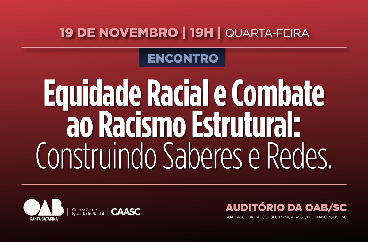 A OAB/SC, por meio da Comissão de Igualdade Racial, promove, no dia 19 de novembro, às 19h, o evento “Equidade Racial e Combate ao Racismo Estrutural: construindo saberes e redes”, no auditório da Seccional. A atividade marca o Mês da Consciência Negra e tem como propósito fomentar o debate sobre as desigualdades raciais, buscando fortalecer uma advocacia comprometida com a equidade, a inclusão e o respeito à diversidade.
