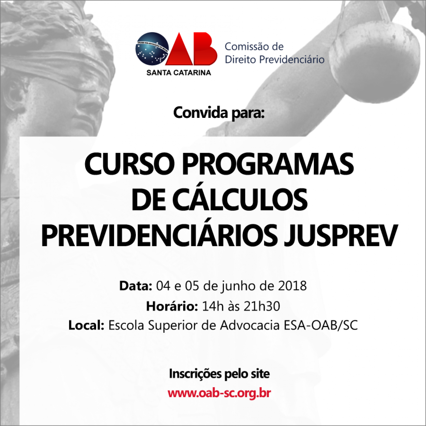 A Comissão de Direito Previdenciário da OAB/SC promove nestas segunda (4) e quarta-feira (5) de junho o Curso de Cálculos Previdenciários Jusprev. As aulas ocorrem das 14h às 21h30, no espaço da Escola Superior de Advocacia, na Seccional.
