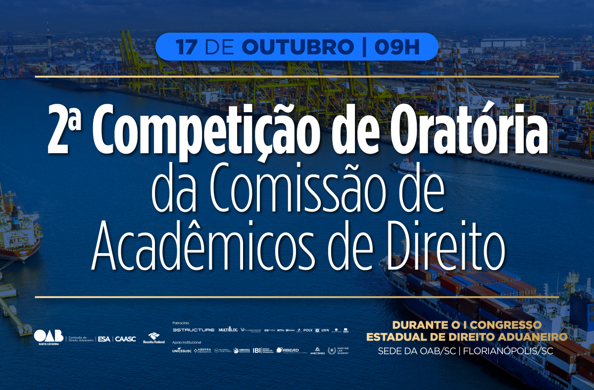 A OAB/SC tem o prazer de anunciar a 2ª Competição de Oratória da Comissão de Acadêmicos de Direito, que será realizada no dia 17 de outubro de 2025, a partir das 9h, durante o I Congresso de Direito Aduaneiro. A iniciativa oferece uma oportunidade única para os acadêmicos de Direito desenvolverem suas habilidades de argumentação e expressão oral, essenciais para a prática jurídica.