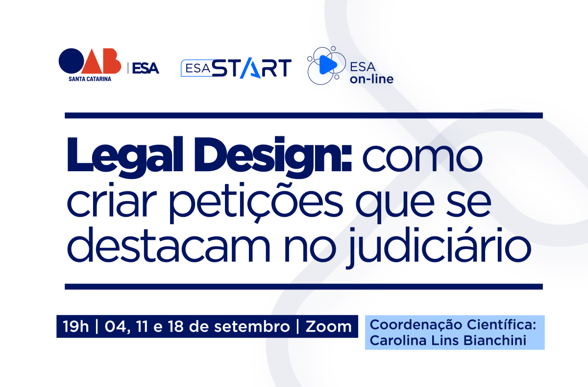 A Escola Superior da Advocacia da OAB/SC promove, nos dias 4, 11 e 18 de setembro, sempre às 19h, o curso online “Legal Design: como criar petições que se destacam no Judiciário”. Com carga horária total de 6 horas/aula, a formação será online, pela plataforma Zoom e trará ferramentas práticas para tornar a produção de documentos jurídicos mais claros, objetivos e persuasivos.