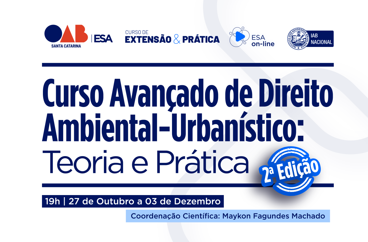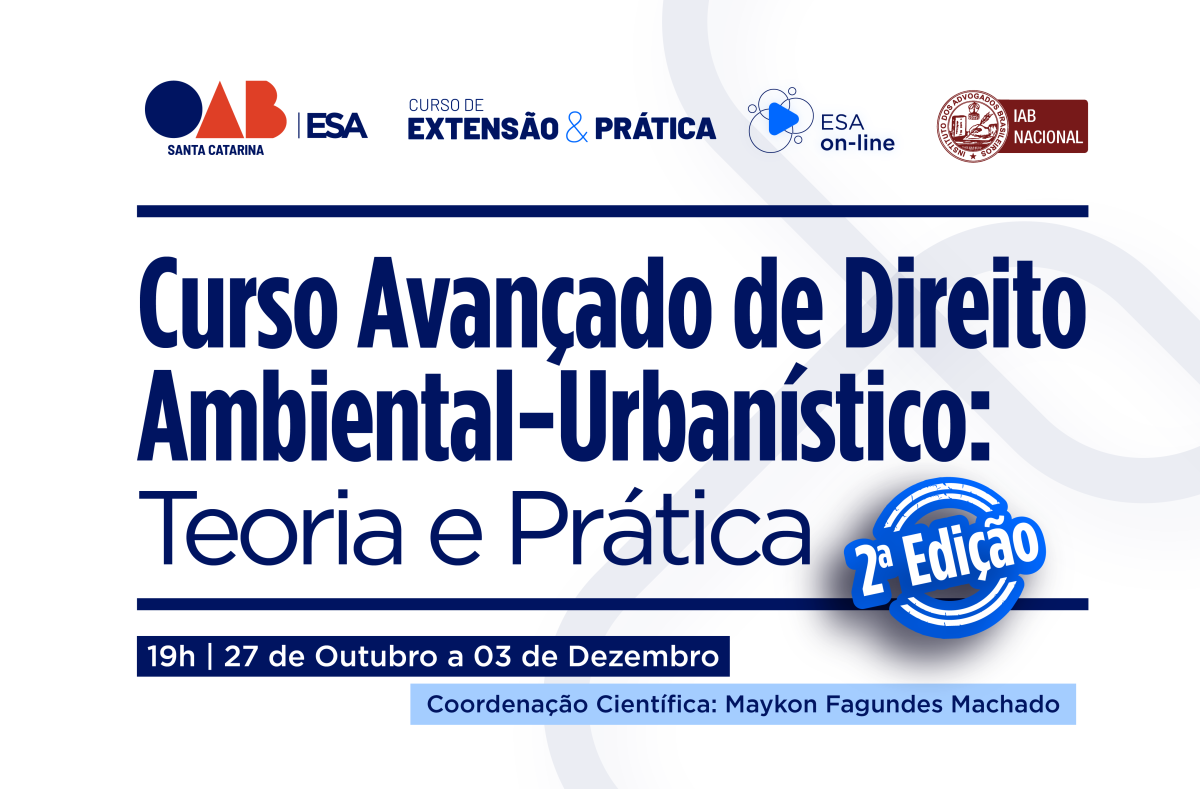 Entre os dias 27 de outubro e 3 de dezembro, sempre às 19h, a OAB Santa Catarina, por meio da Escola Superior de Advocacia (ESA), oferece a 2ª edição do Curso Avançado de Direito Ambiental-Urbanístico: Teoria e Prática, totalmente gratuito e online via Zoom. Uma oportunidade exclusiva para advogados(as) que querem atualizar-se em uma área estratégica, ampliar sua atuação e se destacar no mercado jurídico.