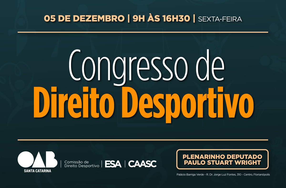 A OAB Santa Catarina, por meio da Comissão Estadual de Direito Desportivo, promove no dia 5 de dezembro, das 9h às 16h30, na Assembleia Legislativa de Santa Catarina, o Congresso de Direito Desportivo . O evento reúne profissionais com atuação direta no universo esportivo, oferecendo à advocacia e ao mercado uma visão atualizada sobre os principais temas que movimentam essa área em expansão. Faça sua inscrição aqui.