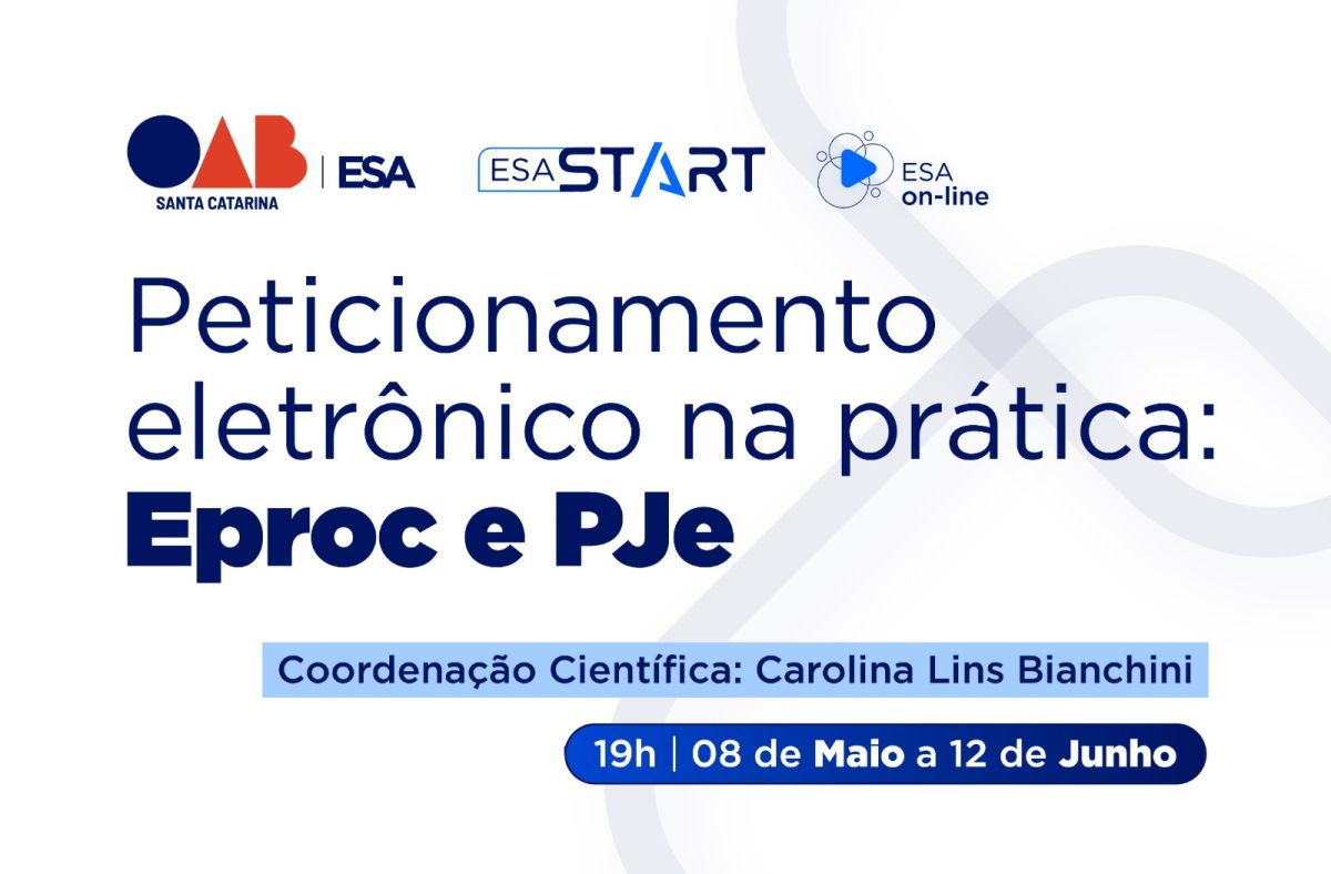 A atuação no processo eletrônico exige domínio técnico e atualização constante. Para auxiliar advogadas e advogados nesse desafio, a Escola Superior da Advocacia da OAB Santa Catarina (ESA/SC) promove o curso “Peticionamento Eletrônico na Prática: E-proc e PJe”, que acontece nos dias 8, 15 e 22 de maio, com transmissão ao vivo pela plataforma Zoom. As inscrições estão ABERTAS, garanta sua vaga aqui com 20% de desconto.