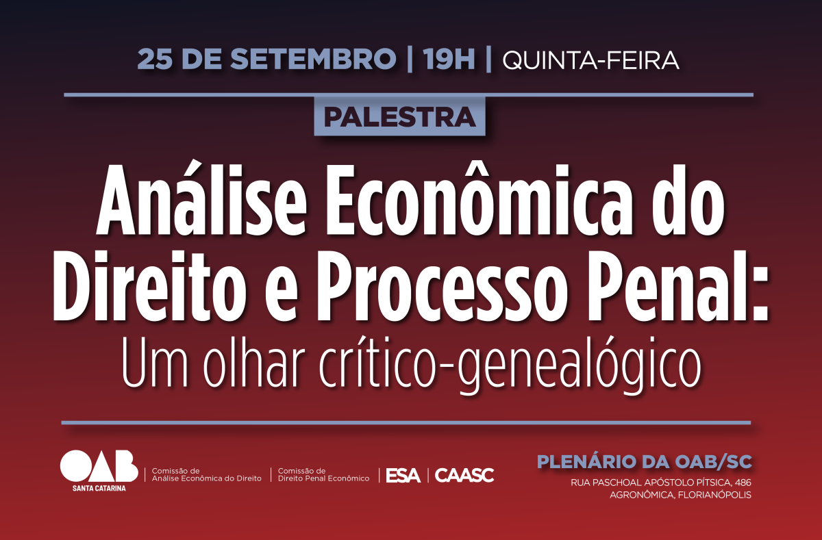 A OAB Santa Catarina, por meio das comissões de Análise Econômica do Direito e Direito Penal Econômico, promovem no dia 25 de setembro, às 19h, no plenário da Seccional, o evento “Análise Econômica do Direito e Processo Penal: um olhar crítico-genealógico”. A atividade gratuita propõe uma reflexão aprofundada sobre como as categorias econômicas vêm moldando o Direito e impactando o Processo Penal contemporâneo. O encontro conta com o apoio da CAASC e da ESA/SC.