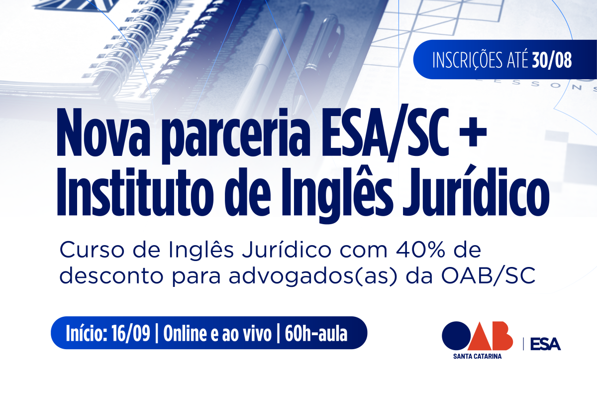 Quer aprimorar seu inglês jurídico e expandir sua atuação internacional? Advogados e advogadas inscritos na OAB/SC agora têm uma oportunidade exclusiva: a Escola Superior de Advocacia da OAB/SC (ESA/SC), em parceria com o Instituto de Inglês Jurídico, oferece 40% de desconto no curso de Inglês Jurídico , com conteúdos práticos, atualizados e diretamente aplicáveis à rotina profissional, essenciais para quem busca atuar no mercado global.