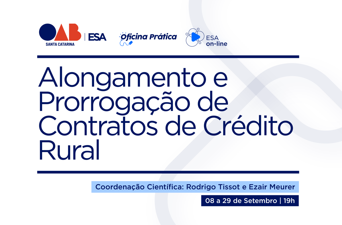 Num cenário de mudanças climáticas, instabilidade produtiva e desafios financeiros no campo, compreender os mecanismos legais que permitem o alongamento e a prorrogação de contratos de crédito rural tornou-se essencial para produtores, advogados e profissionais que atuam na área. Com esse propósito, a Escola Superior de Advocacia da OAB/SC (ESA/SC) promove, nos dias 08, 15, 22 e 29 de setembro de 2025, sempre às 19h, a Oficina Prática: Alongamento e Prorrogação de Contratos de Crédito Rural, em formato virtual (Zoom). Garanta sua vaga aqui.