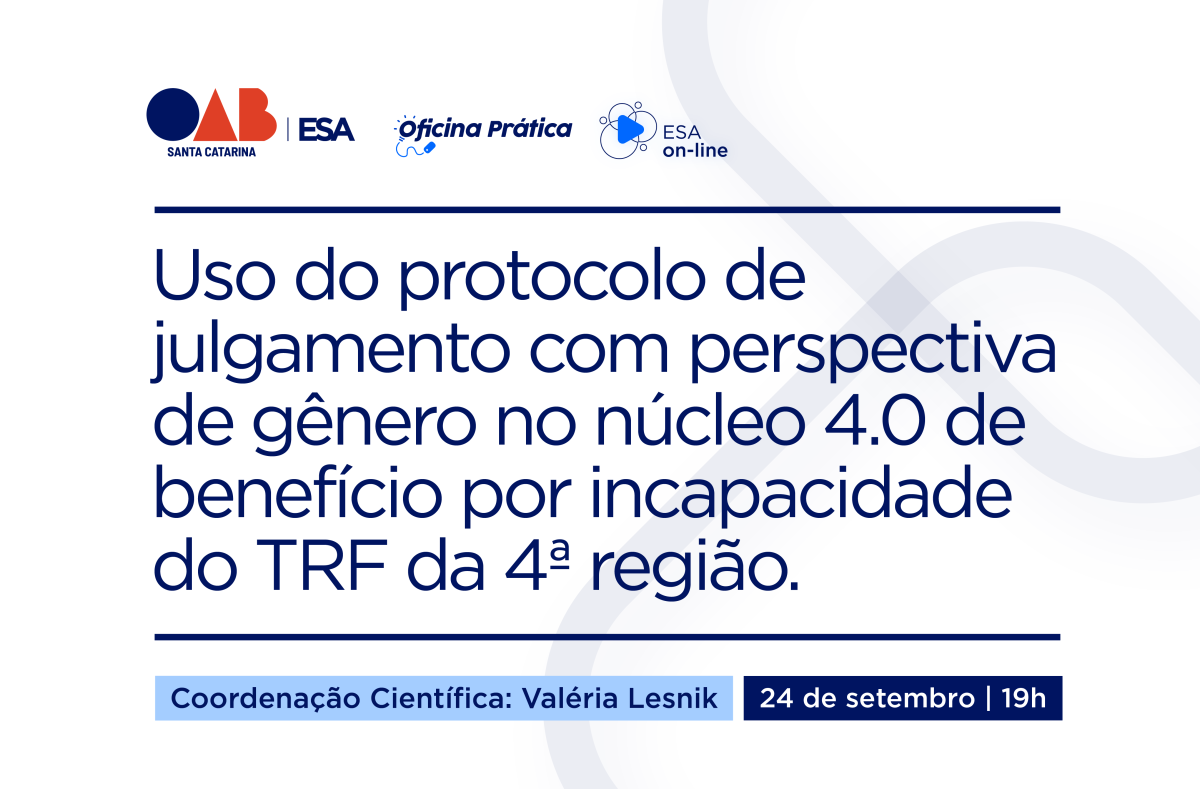 Com as recentes mudanças no sistema eproc, que incorporaram ferramentas baseadas no protocolo da perspectiva de gênero para análise de ações de benefícios por incapacidade, é fundamental que a advocacia esteja preparada para atuar de forma prática e estratégica. Pensando nisso, a Escola Superior da Advocacia da OAB/SC (ESA/SC) realiza, no dia 24 de setembro, às 19h, a Oficina Prática Uso do protocolo de julgamento com perspectiva de gênero no núcleo 4.0 de benefício por incapacidade do TRF da 4ª região.
