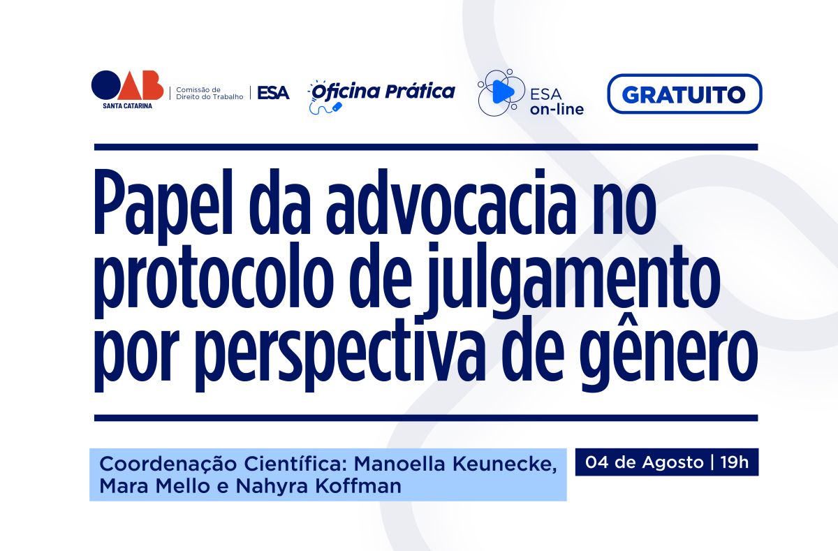 A Escola Superior da Advocacia da OAB/SC (ESA/SC) realiza no próximo dia 4 de agosto, às 19h, a oficina “Papel da advocacia no Protocolo de Julgamento com Perspectiva de Gênero”, com transmissão online e gratuita pela plataforma Zoom. A iniciativa busca qualificar a advocacia catarinense para a aplicação prática do protocolo, fortalecendo o compromisso da classe com a promoção da igualdade no sistema de Justiça.
