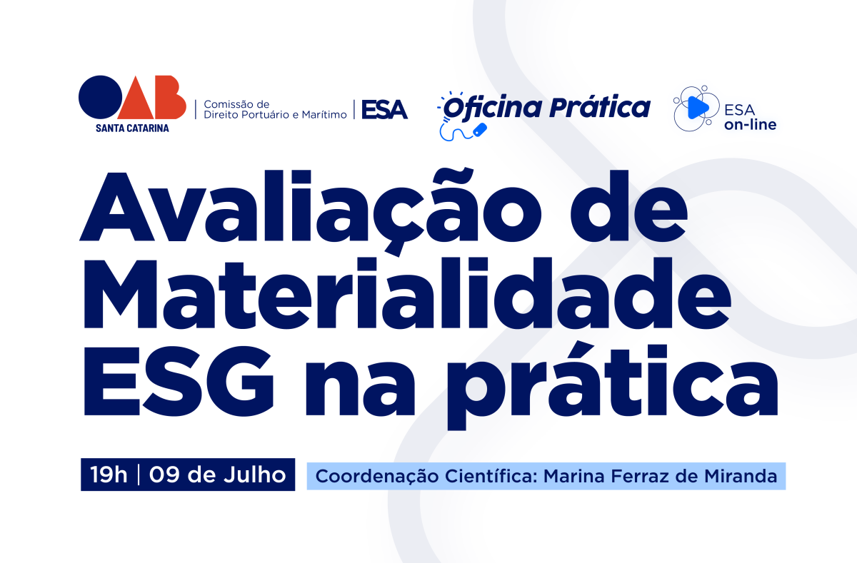 A OAB/SC, por meio da Escola Superior de Advocacia (ESA/SC), realiza no dia 9 de julho, às 19h, o curso "Avaliação de Materialidade ESG na Prática", com transmissão ao vivo pela plataforma Zoom, via ESA Online. Com 3 horas de duração, a capacitação está com inscrições abertas – garanta sua vaga aqui.