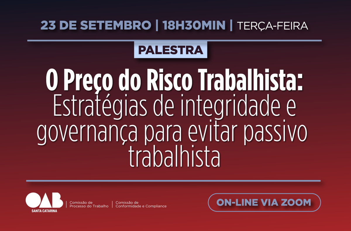 Prevenir litígios é tão importante quanto enfrentá-los, pensando nisso, a OAB Santa Catarina promove, no dia 23 de setembro, às 18h30, o evento online “O Preço do Risco Trabalhista – Estratégias de integridade e governança para evitar passivo trabalhista”. Organizado pela Comissão Estadual de Processo do Trabalho e pela Comissão Estadual de Conformidade e Compliance, o encontro vai mostrar como práticas de integridade, governança corporativa e auditorias de conformidade podem reduzir riscos e fortalecer a advocacia na defesa de empresas e trabalhadores.
