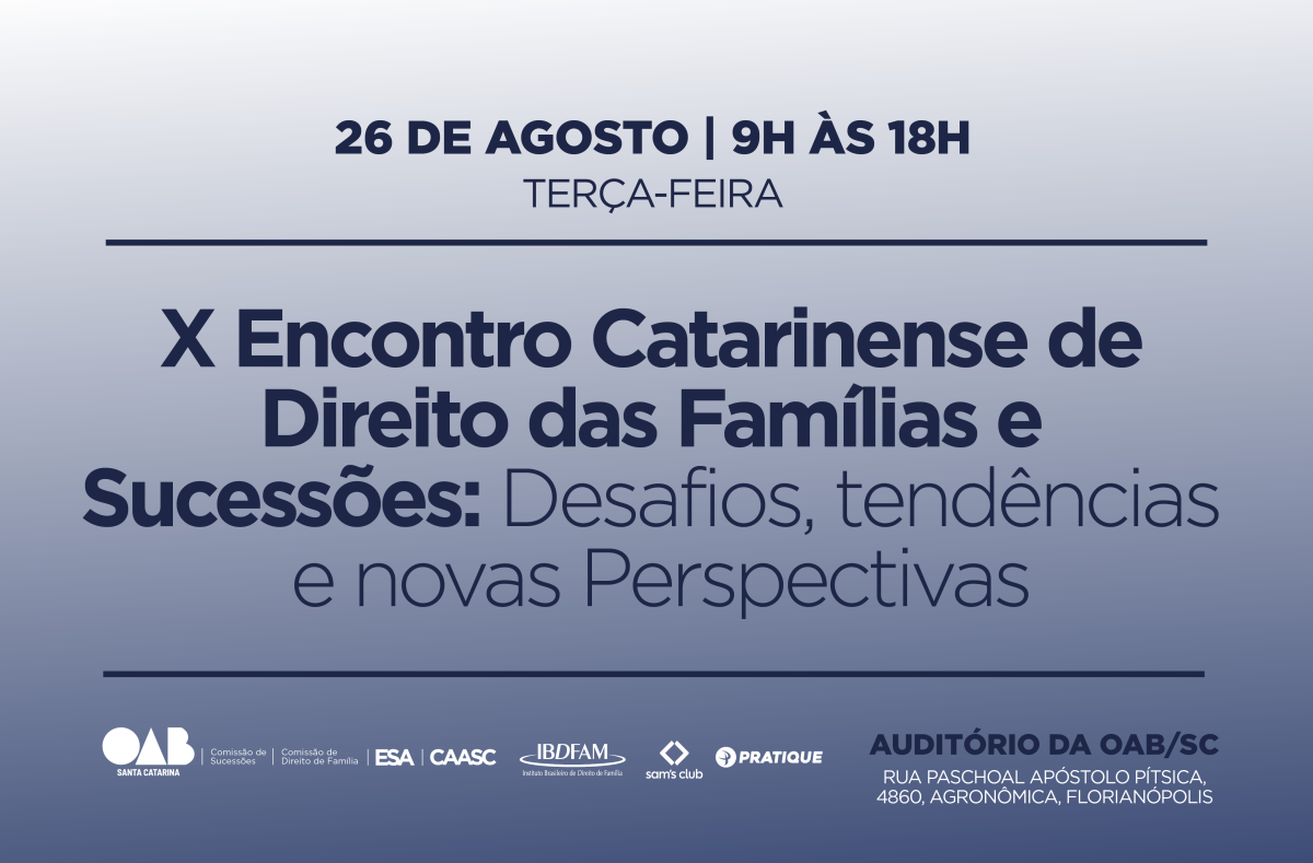 A OAB/SC, por meio das Comissões de Famílias e de Sucessões, promove no dia 26 de agosto, das 9h às 18h, na sede da Seccional, um encontro com grandes nomes do Direito: “X Encontro Catarinense de Direito das Famílias e Sucessões: Desafios, tendências e novas Perspectivas”. A programação inclui temas atuais e sensíveis como divórcio, planejamento sucessório, inovação no registro civil, parentalidade e finitude.