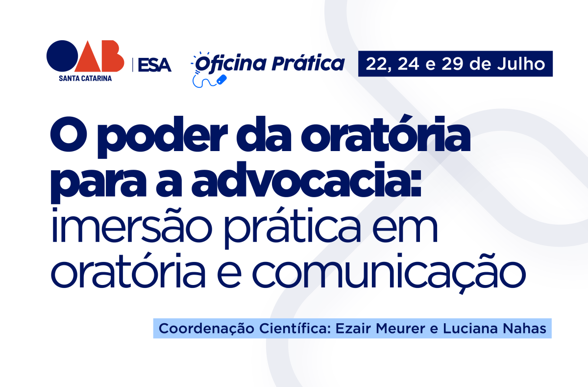 A Escola Superior da Advocacia da OAB/SC realiza, nos dias 22, 24 e 29 de julho, sempre às 19h, a oficina virtual “O poder da oratória para a advocacia: imersão prática em oratória e comunicação”. A atividade será transmitida via plataforma Zoom, com carga horária total de 9 horas/aula. As inscrições já estão abertas e podem ser feitas aqui.