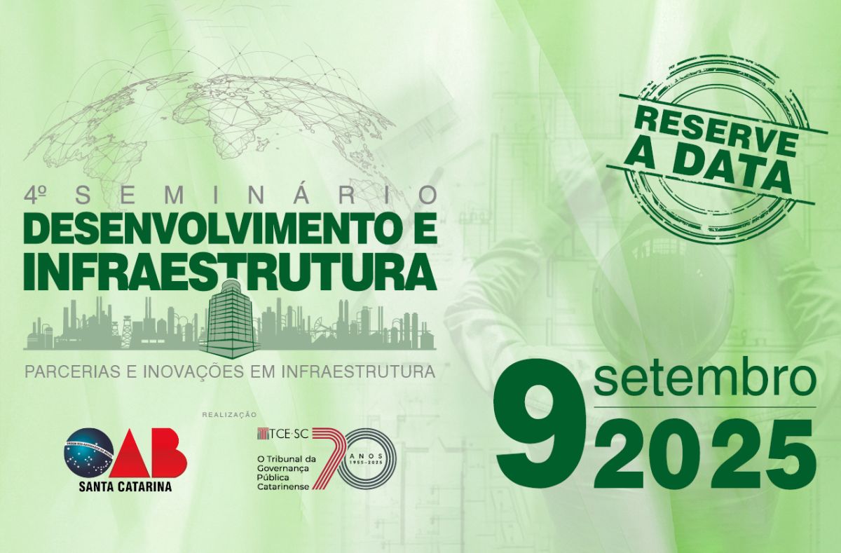 A OAB/SC, por meio da Comissão de Infraestrutura, PPPs e Concessões, e o Tribunal de Contas de Santa Catarina (TCE/SC) promovem, no dia 9 de setembro, o IV Seminário de Desenvolvimento e Infraestrutura, que será realizado no auditório do TCE/SC, em Florianópolis. As inscrições já estão abertas e podem ser feitas aqui, de forma gratuita.