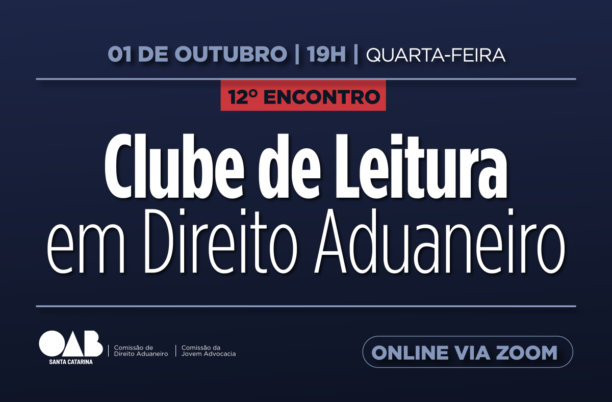 A OAB Santa Catarina, por meio das Comissões Estaduais da Jovem Advocacia e de Direito Aduaneiro, realiza no dia 1º de outubro, às 19h, o 12º encontro do Clube de Leitura em Direito Aduaneiro. A atividade será online, gratuita e transmitida pela plataforma Zoom. As inscrições podem ser feitas aqui.
