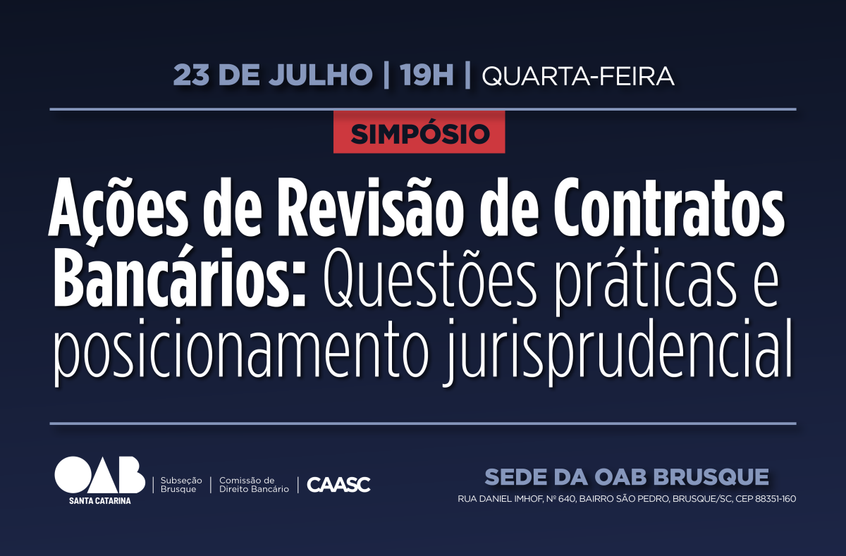A OAB/SC, por meio da Comissão de Direito Bancário, em parceria com a Comissão de Direito Bancário da Subseção de Brusque, promove no dia 23 de julho, às 19h, o simpósio “Ações de Revisão de Contratos Bancários: questões práticas e posicionamento jurisprudencial”. O evento será presencial, no auditório da OAB em Brusque, com entrada solidária mediante a doação de alimentos não perecíveis ou produtos de limpeza.