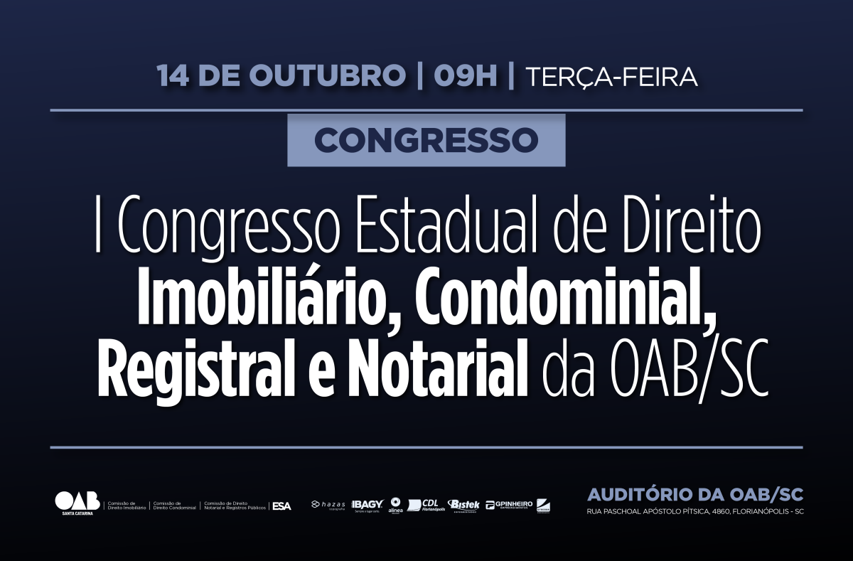No dia 14 de outubro, a partir das 9h, o auditório da OAB/SC em Florianópolis será palco do I Congresso Estadual de Direito Imobiliário, Condominial, Registral e Notarial , um evento inédito que reunirá grandes especialistas para debater os principais desafios e tendências que impactam diretamente a advocacia e o mercado imobiliário catarinense. Faça sua inscrição e confira a programação completa aqui.