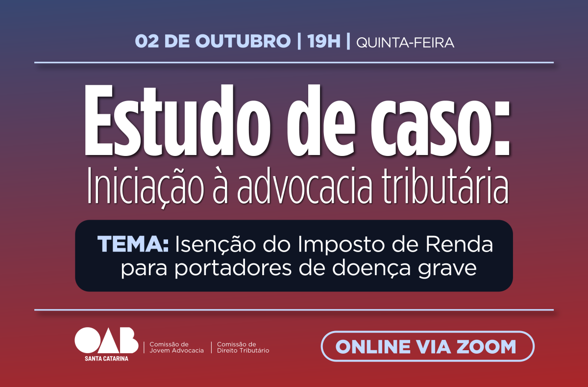A OAB/SC promove no dia 02 de outubro, às 19h, o evento online Estudo de caso – Iniciação à advocacia tributária, organizado pela Comissão Estadual da Jovem Advocacia em parceria com a Comissão Estadual de Direito Tributário. A atividade integra um projeto que busca oferecer à jovem advocacia vivência prática na área tributária, por meio da análise de casos reais e da participação de especialistas.