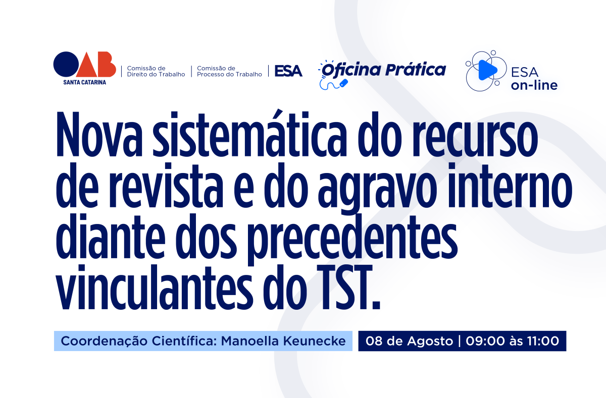 Com a recente criação do novo agravo interno nos Tribunais Regionais do Trabalho, por meio da Resolução nº 224/2024 do TST, a advocacia trabalhista passou a enfrentar uma nova e desafiadora sistemática nos recursos de revista. Para esclarecer as principais dúvidas sobre o tema e orientar a prática profissional, a Escola Superior da Advocacia da OAB/SC (ESA/SC) promove, no dia 8 de agosto, às 9h, a oficina virtual “Nova Sistemática do Recurso de Revista e do Agravo Interno diante dos Precedentes Vinculantes do TST”.
