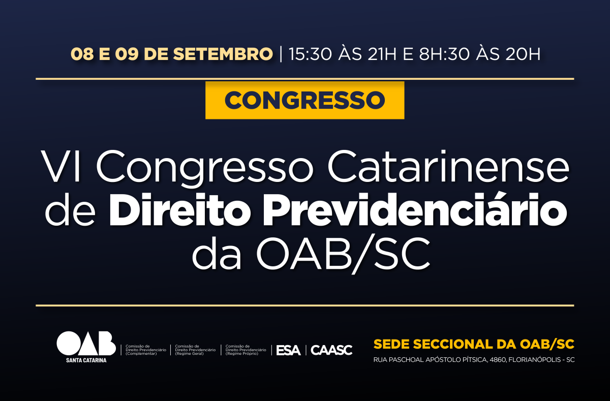 Prepare-se para o VI Congresso Catarinense de Direito Previdenciário, que ocorrerá nos dias 08 e 09 de setembro de 2025, na sede da OAB/SC, em Florianópolis. Promovido pelas Comissões de Direito Previdenciário – Regime Geral, Regime Próprio e Previdência Complementar – o congresso é uma oportunidade imperdível para advogados e advogadas se atualizarem, debaterem as últimas mudanças na legislação e aprimorarem suas práticas profissionais.