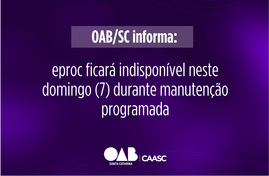A OAB Santa Catarina informa à advocacia catarinense que o sistema eproc de 1º e 2º Graus ficará indisponível no próximo domingo, 7 de setembro, das 19h30 às 23h30, em razão de manutenção programada pelo Tribunal de Justiça de Santa Catarina (TJSC).