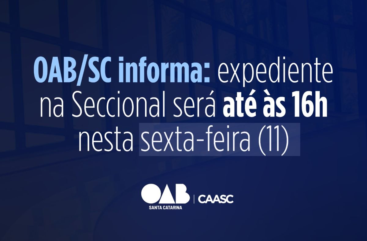 A OAB Santa Catarina informa que, excepcionalmente nesta sexta-feira (11/07), o expediente na sede da Seccional será encerrado às 16h.