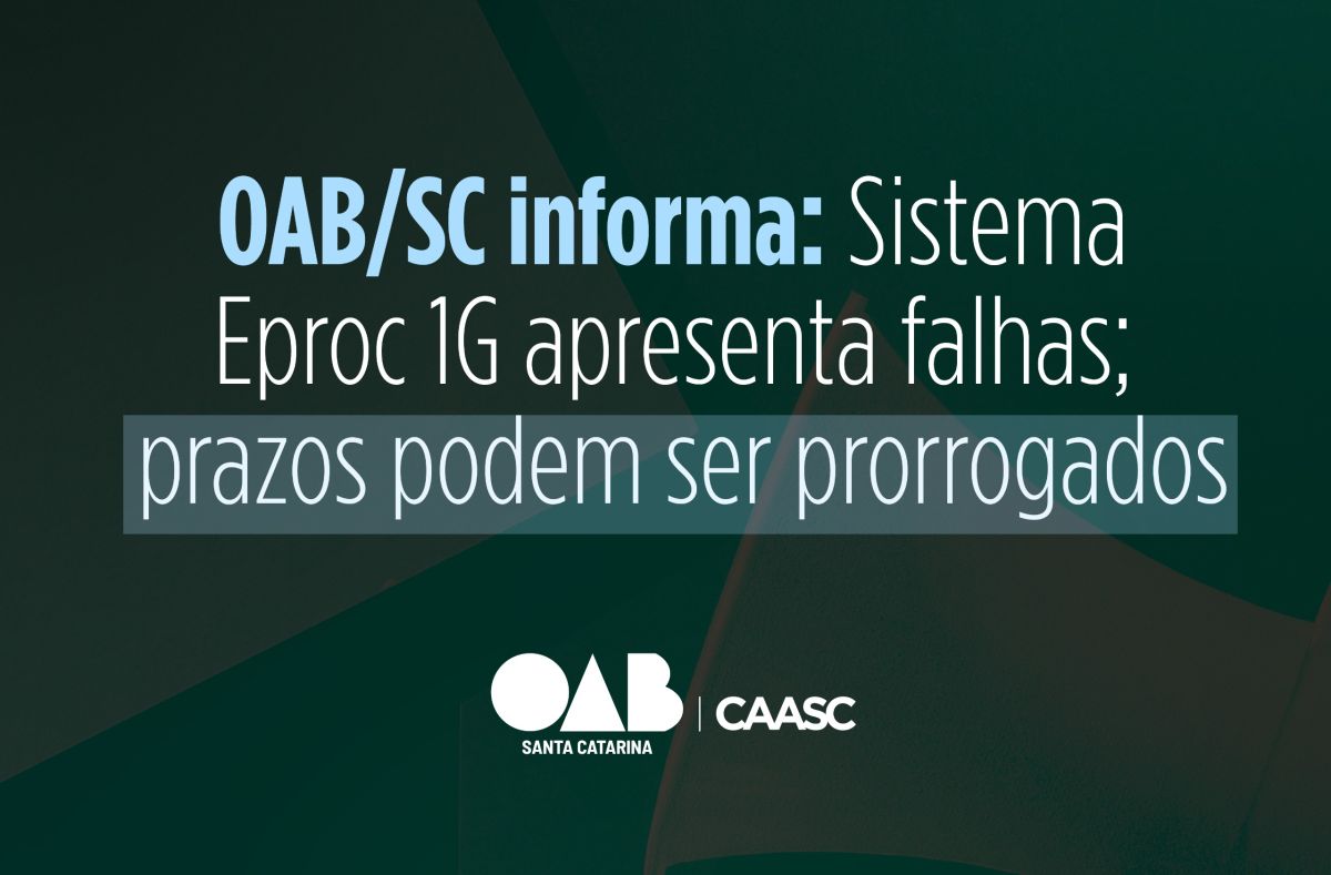 A OAB Santa Catarina informa que o sistema eproc 1G, utilizado pelo Poder Judiciário de Santa Catarina, está apresentando instabilidades nesta sexta-feira (30), conforme comunicado divulgado pela Diretoria de Suporte à Jurisdição de Primeiro Grau (DSJPG) do Tribunal de Justiça de Santa Catarina (TJSC).