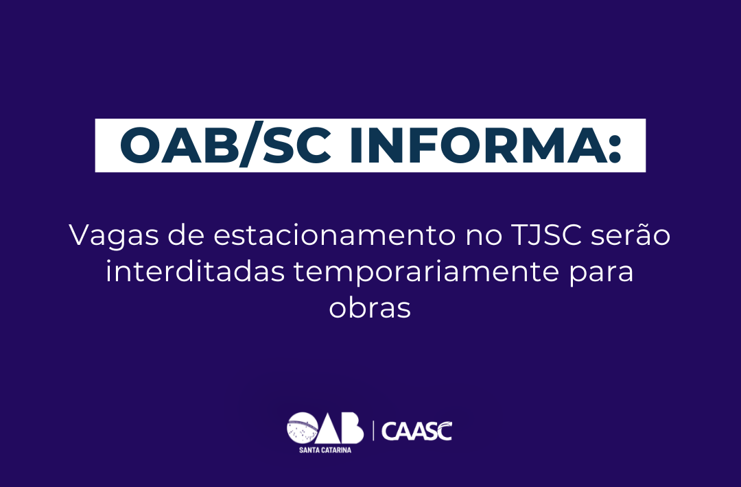 A OAB Santa Catarina informa que, entre os dias 17 e 30 de junho de 2025, as vagas de estacionamento nº 525 e 526, cedidas à Seccional e localizadas na entrada do Tribunal de Justiça de Santa Catarina (TJSC), estarão provisoriamente interditadas devido à continuidade das obras de manutenção no imóvel, com intervenções previstas na guarita de acesso ao Tribunal.
