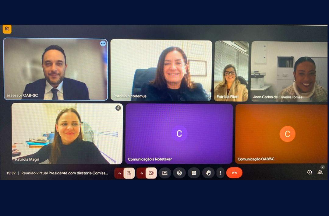 Cumprindo a agenda institucional do dia, o presidente da OAB Santa Catarina, Juliano Mandelli, realizou na tarde desta quarta-feira (25) uma reunião virtual com a diretoria da Comissão Estadual OAB Por Elas. Durante o encontro, foi apresentado e debatido o planejamento das ações para a gestão 2025/2027. Participaram da reunião Patrícia Nicodemus Valenzuela, presidente da Comissão; Patrícia Christina Fileti, vice-presidente; Silvana Travasso, secretária-geral; e Patrícia Magri, secretária-geral adjunta.