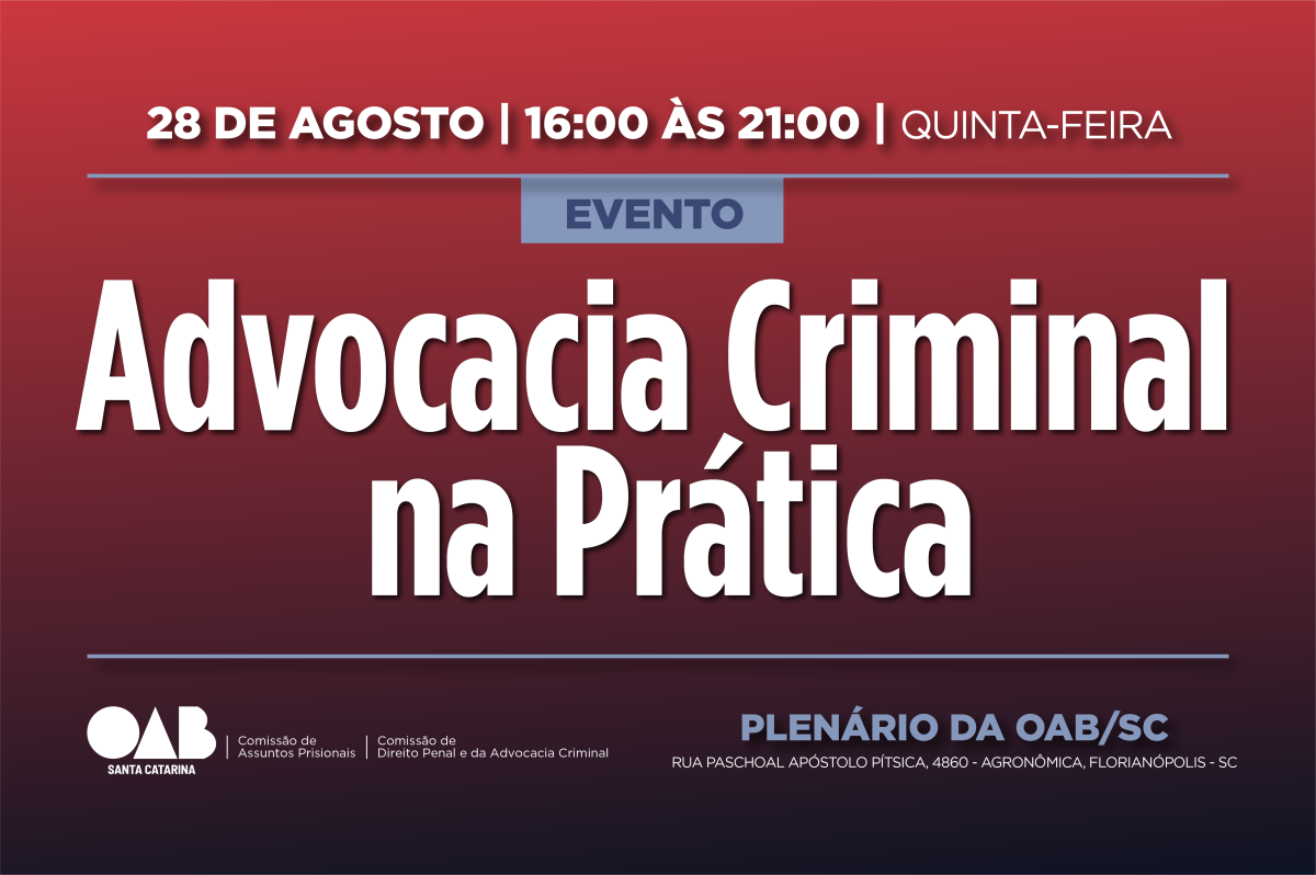 Dentro da programação especial do mês da advocacia, a OAB/SC realiza no dia 28 de agosto, das 16h às 21h, o evento “Advocacia Criminal na Prática”, no Plenário da Seccional, em Florianópolis. A iniciativa reunirá grandes nomes da área em um ciclo de palestras voltado à atualização profissional, troca de experiências e debate sobre os principais desafios enfrentados no cotidiano da advocacia criminal.