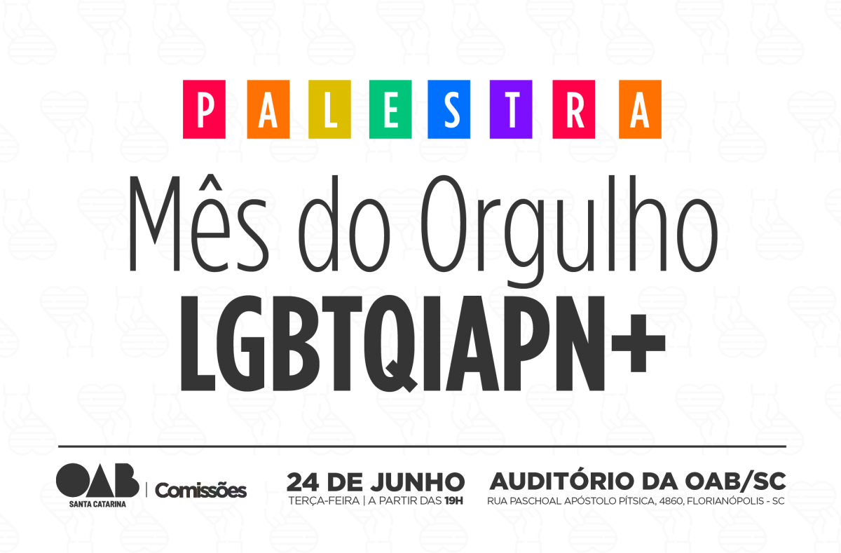 Em compromisso com a promoção dos direitos humanos, da diversidade e da inclusão social, a OAB/SC realiza, no dia 24 de junho, a palestra “Celebrando o Orgulho LGBTQIAPN+: Direitos e Inclusão Social”, com início às 19h, no Auditório da Seccional, em Florianópolis. O evento é gratuito e aberto ao público. Inscreva-se aqui.
