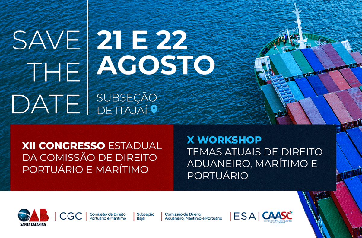 Nos dias 21 e 22 de agosto, a OAB Santa Catarina realiza, por meio da Comissão Estadual de Direito Portuário e Marítimo, a 12ª edição do Congresso Estadual de Direito Portuário e Marítimo. O evento, já consolidado como um dos mais relevantes do setor no estado, acontecerá na Subseção de Itajaí e promete dois dias inteiros de programação intensa, com debates de alto nível, painéis técnicos e uma rica troca de experiências entre especialistas, advogados, autoridades e representantes institucionais.