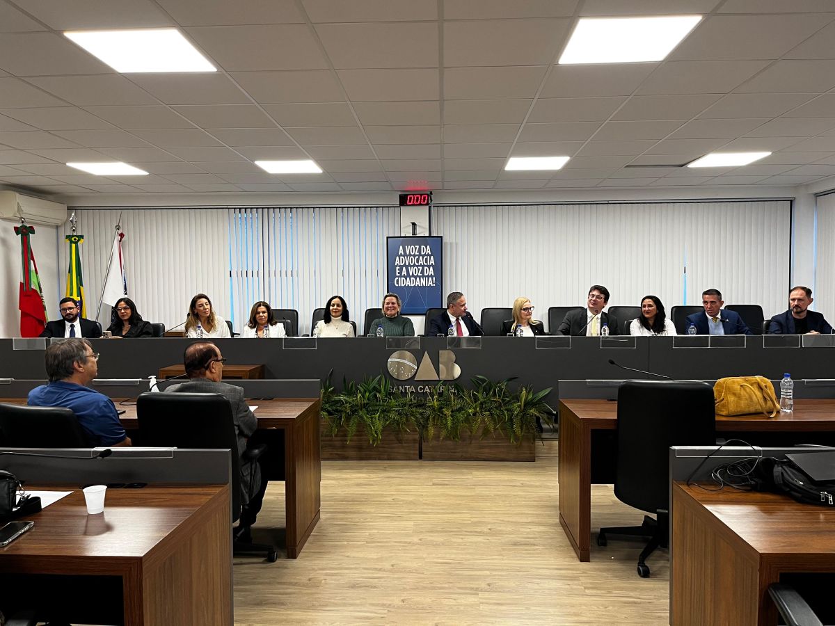 A OAB/SC sediou, na tarde desta quarta-feira (28), a Reunião Presencial do Conselho Curador dos Honorários Advocatícios (CCHA) com as carreiras da Advocacia-Geral da União (AGU), promovida pela Comissão da Advocacia Pública Federal da Seccional. O encontro foi realizado no Plenário da OAB/SC, na sede da instituição, em Florianópolis.
