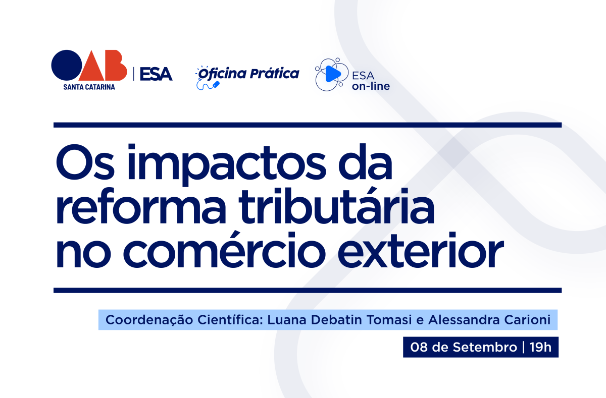 A Escola Superior da Advocacia da OAB/SC, (ESA/SC), promoverá no próximo dia 8 de setembro, das 19h às 22h, uma oficina online com um tema crucial para os profissionais do Direito e do comércio exterior: “Os Impactos da Reforma Tributária no Comércio Exterior”. O evento será online, via Zoom. As inscrições estão abertas e podem ser realizadas neste link.