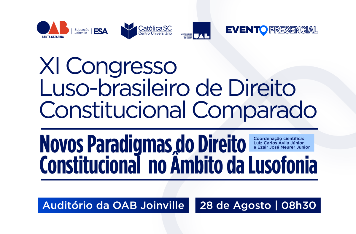 A advocacia e o ensino jurídico estão prestes a viver um momento histórico. No dia 28 de agosto, a cidade de Joinville sediará a 11ª edição do Congresso Luso-Brasileiro de Direito Constitucional Comparado, com o tema: Novos Paradigmas do Direito Constitucional no Âmbito da Lusofonia.O eventoocorrerá noAuditório da OAB Joinville, a partir das a partir das 8h30.
