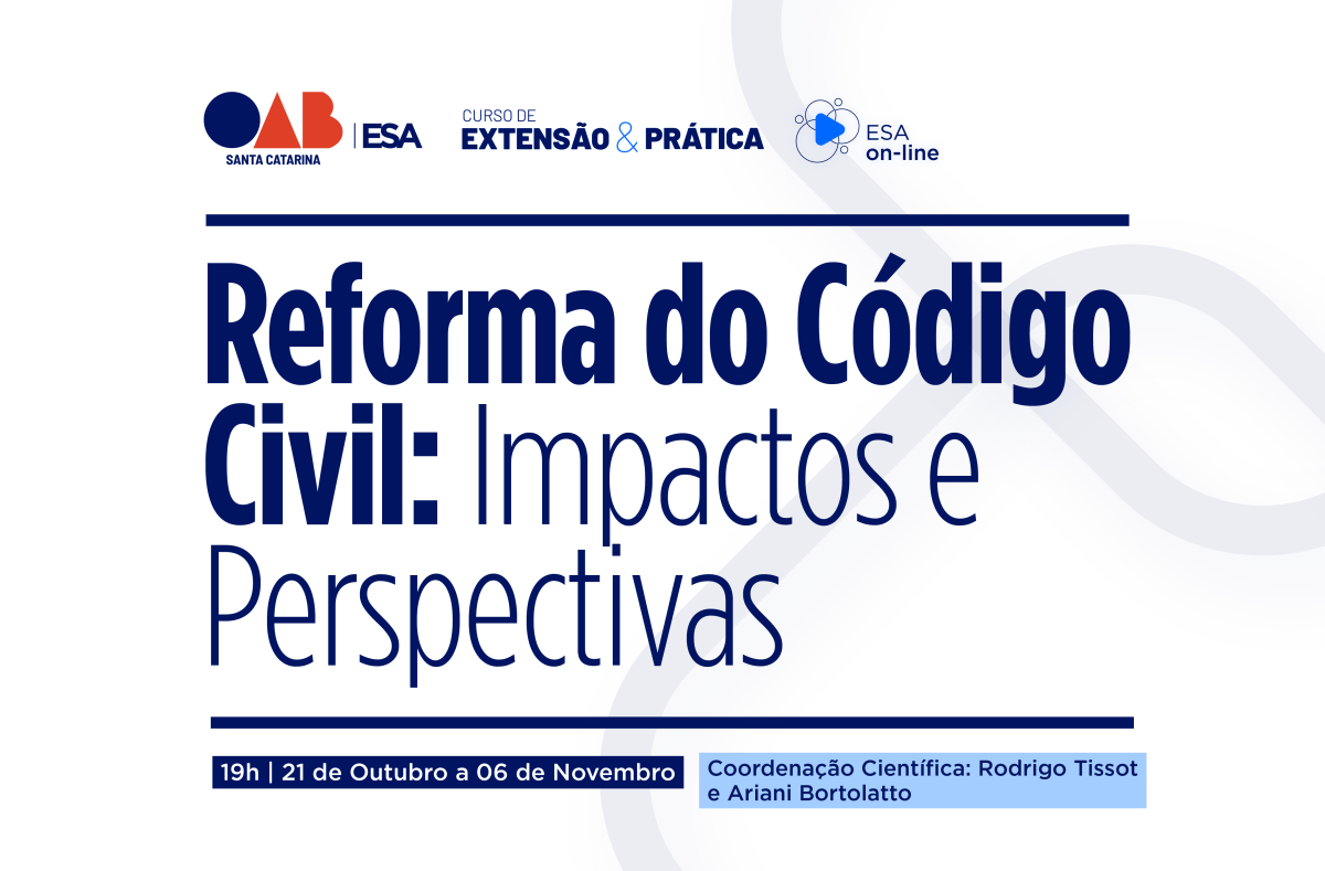 A proposta de Reforma do Código Civil Brasileiro (PL n. 4/2025) está entre os temas legislativos mais relevantes e debatidos das últimas décadas — uma mudança que promete impactar profundamente a prática jurídica em diversas áreas do Direito Privado. Para antecipar os desafios e oportunidades desse novo cenário, a Escola Superior da Advocacia da OAB/SC (ESA/SC) realiza o curso “Reforma do Código Civil – Impactos e Perspectivas”, uma capacitação completa e atualizada que abordará, de forma crítica e aplicada, os principais pontos da proposta legislativa.