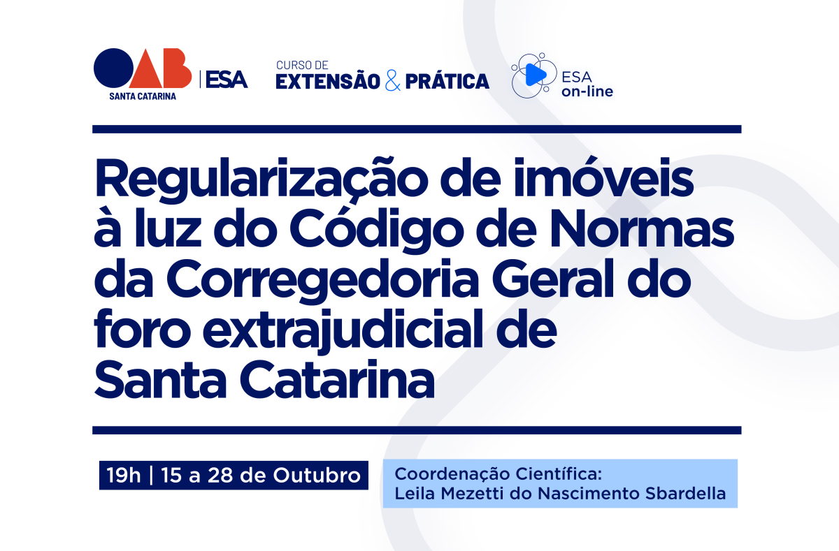A regularização de imóveis é um dos maiores desafios do direito imobiliário contemporâneo, impactando diretamente a segurança jurídica, o desenvolvimento urbano e a valorização patrimonial. Pensando na capacitação da advocacia catarinense diante dessas demandas, a Escola Superior da Advocacia da OAB/SC (ESA/SC) promove, nos dias 15, 20, 22 e 28 de outubro, sempre às 19h, o curso “Regularização de Imóveis à luz do Código de Normas da Corregedoria Geral do Foro Extrajudicial de Santa Catarina” .