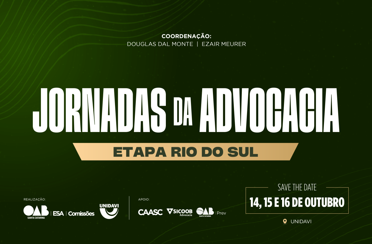 Cumprindo o compromisso de levar conhecimento e valorização profissional para todos os cantos de Santa Catarina, a OAB Santa Catarina realiza mais uma edição das Jornadas da Advocacia. A próxima etapa acontece em Rio do Sul , nos dias 14, 15 e 16 de outubro, com sede na Unidavi, reunindo especialistas de destaque estadual e nacional.