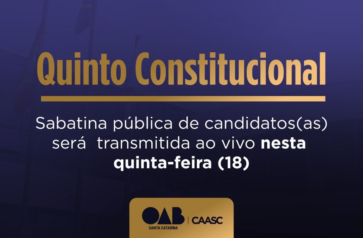 Nesta quinta-feira (18/09), será transmitido ao vivo no canal do Youtube da OAB Santa Catarina (clique aqui), a sabatina pública dos candidatos à vaga de desembargador do Tribunal de Justiça de Santa Catarina (TJSC), destinada ao Quinto Constitucional da Advocacia. Em breve será divulgado o horário da transmissão.